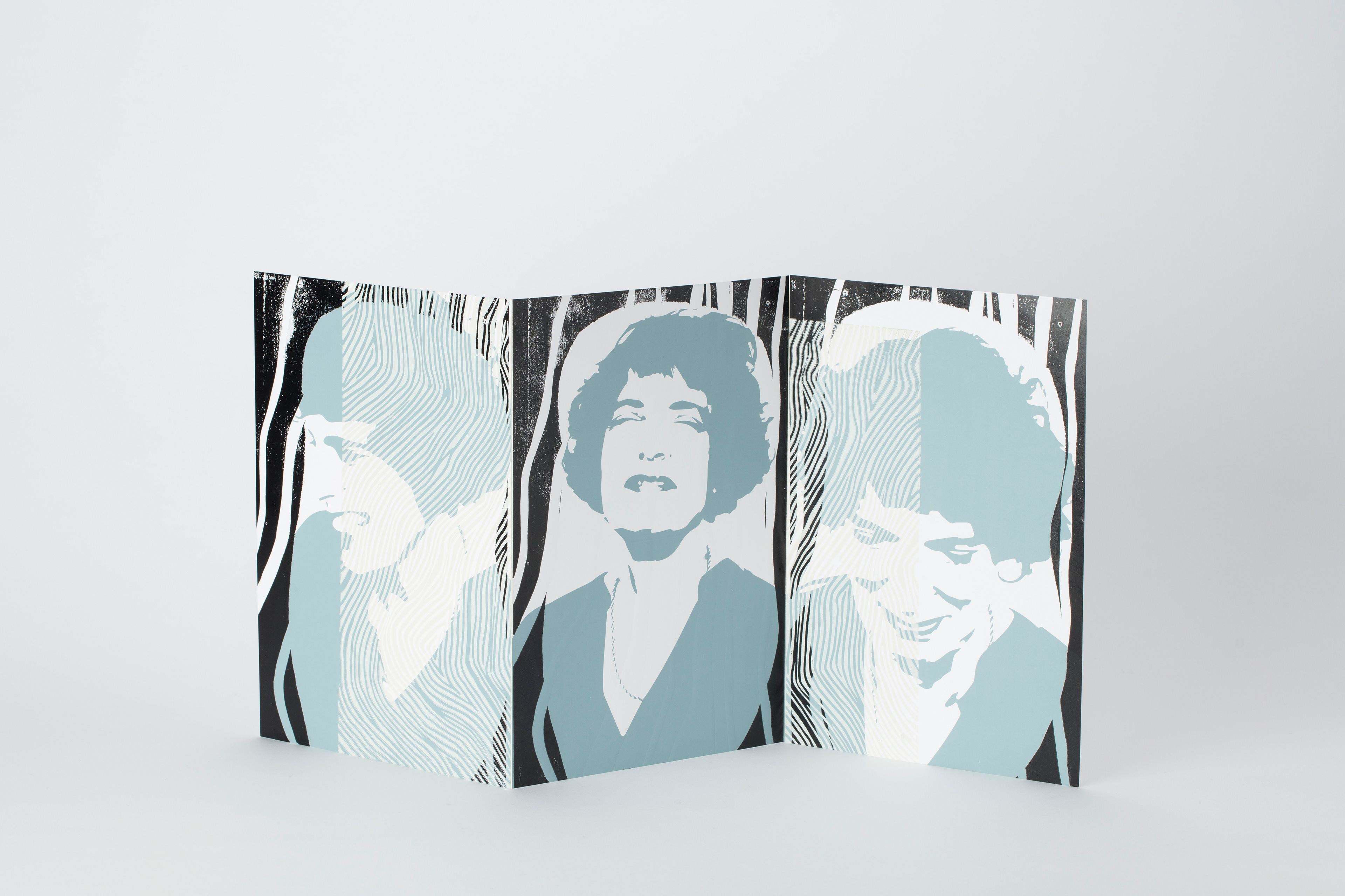 A series of 4 photographs of my mother: realised in screen printing and overprinted with linocuts, which are intended to bring out the hair structure as a detail.
